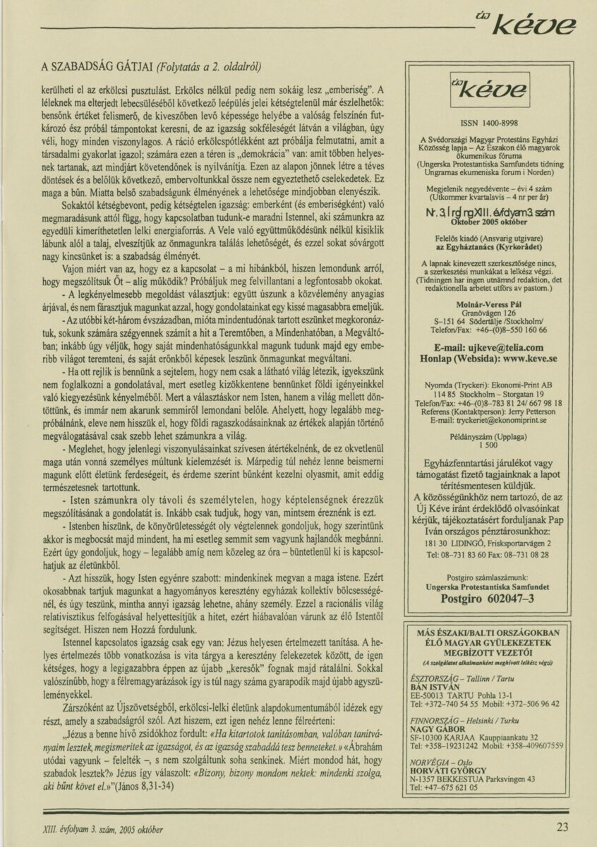 Új Kéve - A svédországi magyar protestáns gyülekezetek lapja. 2005.